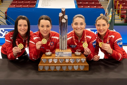 Three-time Scotties champions (l-r) Kerri Einarson, Val Sweeting, Shannon Birchard, Briane Meilleur – Photo: Curling Canada/Andrew Kalver