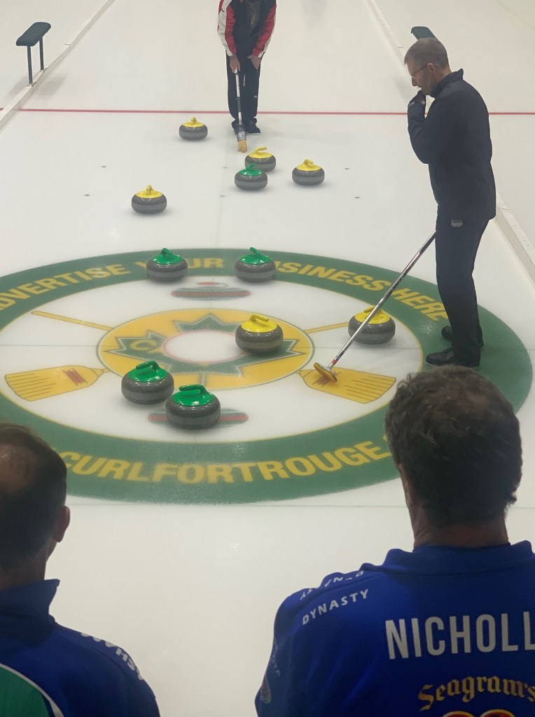 The final against Mahon was tied at 2-2 after five ends. With a lot of rocks in play, Mahon was faced with a series of challenging shots through the final three ends. On the sixth (see picture), Neufeld stole a single when Mahon’s yellow-green-green raise slid through between the two yellow stones in the rings – a steal of one rather than a possible three.