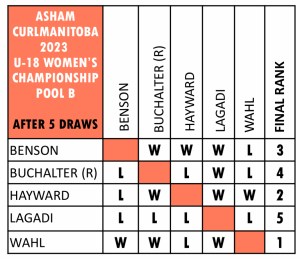 In their final games of the event. Bethany Allan (Granite), with a win over Liv Leadbeater (Swan River), and Rylie Buchalter (Heather), with a win over Meghan Lagadi (Pembina) earned their first victories.