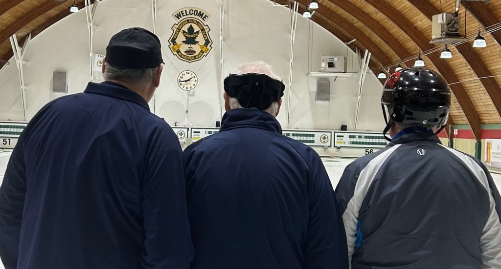Head protection is a good idea for beginning curlers and for those of us who are maybe “a day or two past our prime”. Three different types of head protection were on display in a recent stick-league game at Winnipeg’s Fort Rouge CC.