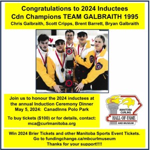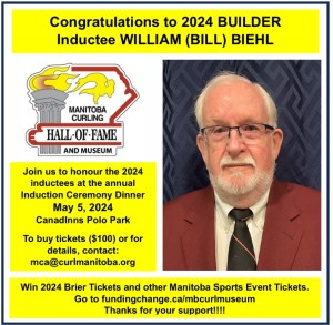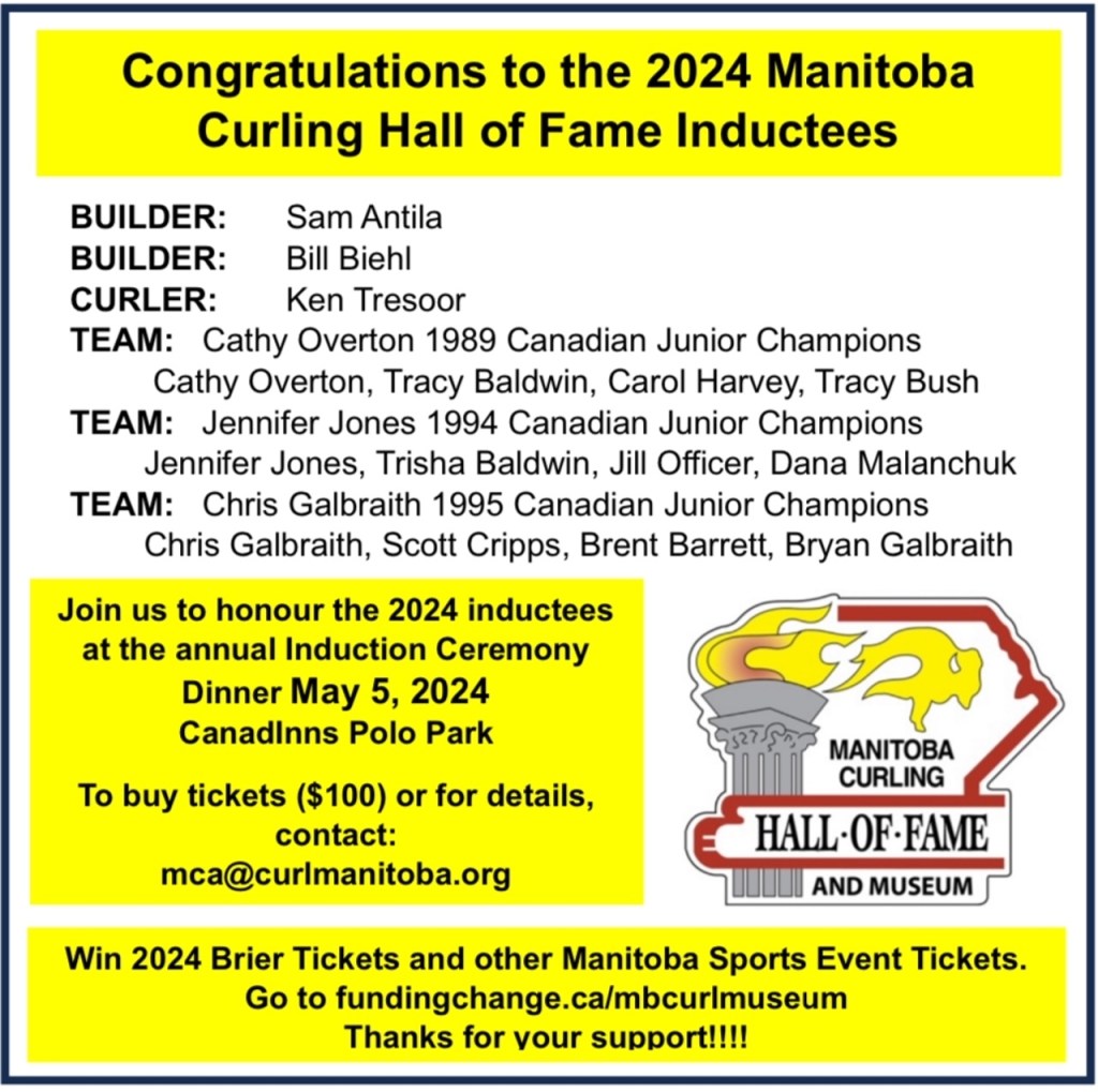 The 2024 Manitoba Curling Hall of Fame Induction Dinner will be hosted at CanadInns Destination Centre Polo Park on May 5, 2024. Dinner ticket prices will be held at $100 for 2024. More complete dinner details will be announced by March 1, 2024.