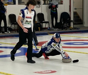 Jace Freeman’s Virden team (Timothy Marin, Nick Senff, Luke Robins, Coach Graham Freeman) and Nash Sugden’s Morden team (Tyler Fehr, Tanner Treichel, Ryan Thiessen, alternate Quinn Lagace, Coach Gord Titchkosky) both have 4W-1L records with a game to play Sunday.