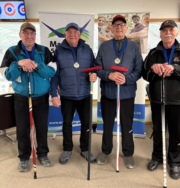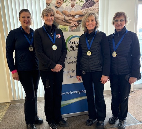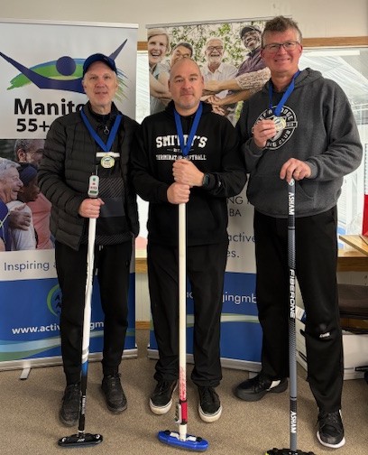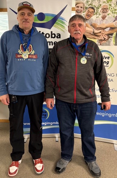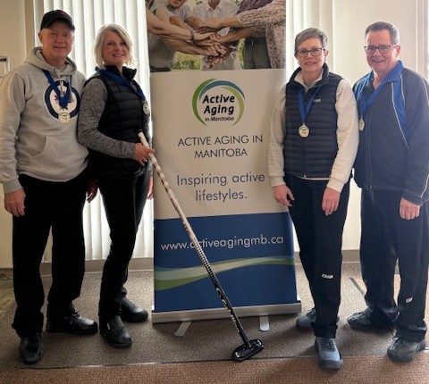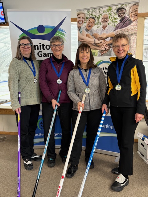 The 4-person team events were won by Andrew Swan – WInnipeg (Men 55+), Ken Hildebrand – Morden (Men 65+), Kathleen Messner – Lorette (Women 55+), Judy Colwell – East St. Paul (Women 65+), and Clare Reimer – Morden (Mixed).