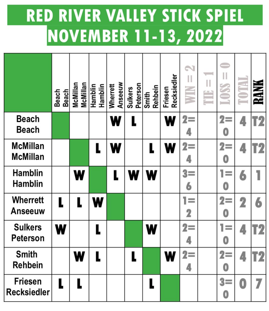 Warren Johnson & Dan McDonald are the only unbeaten team at the completion of round robin play in the first Red River Valley Stick Spiel in Morris. The St. Vital team competed a nearly perfect preliminary round with a nearly perfect 5 wins and a tie – making them the only team not to suffer defeat.