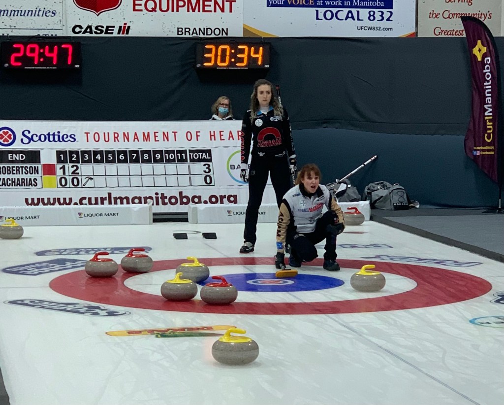 A win Wednesday, 4-3 in an extra end over Quebec, kept Team Manitoba’s hopes very much alive. However, Zacharias faces a very tough day Thursday. On the early draw, they play Alberta’s Laura Walker team and then finish the preliminary round with the game against Team Einarson. With a record of 4W-2L, Zacharias and her Altona team need at least one win, and may need to win both, to have advance.